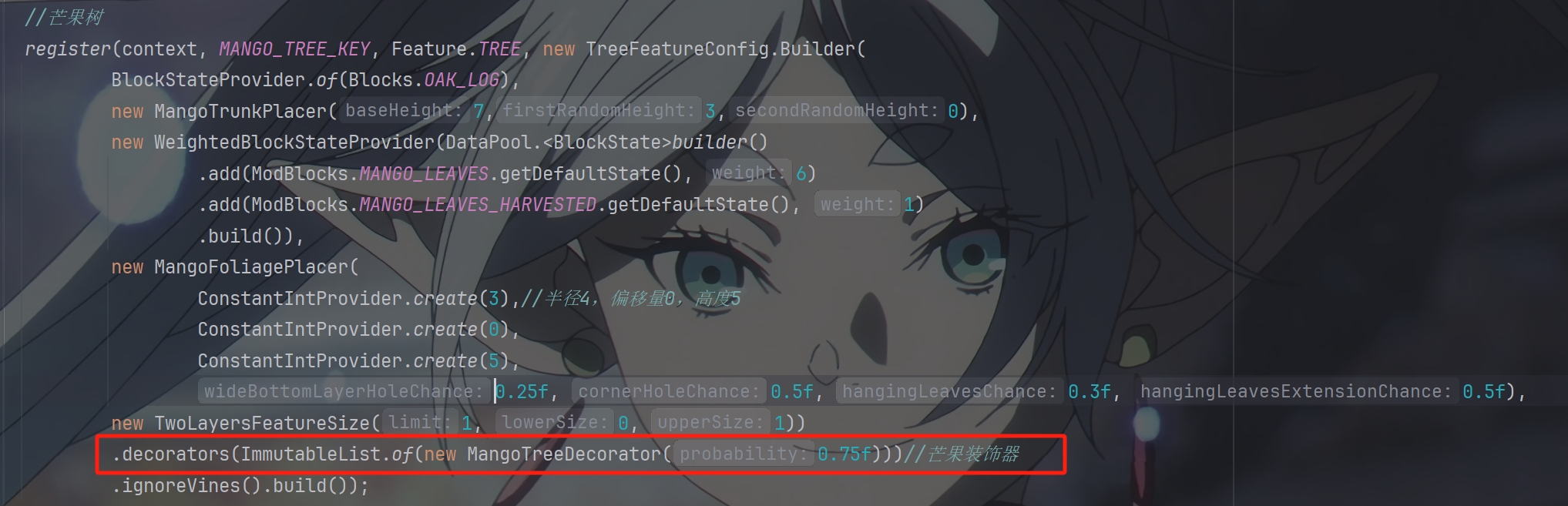 上面通过创建一个 MangoTreeDecorator(0.75f) 的实例并作为装饰器添加到树的特征配置中