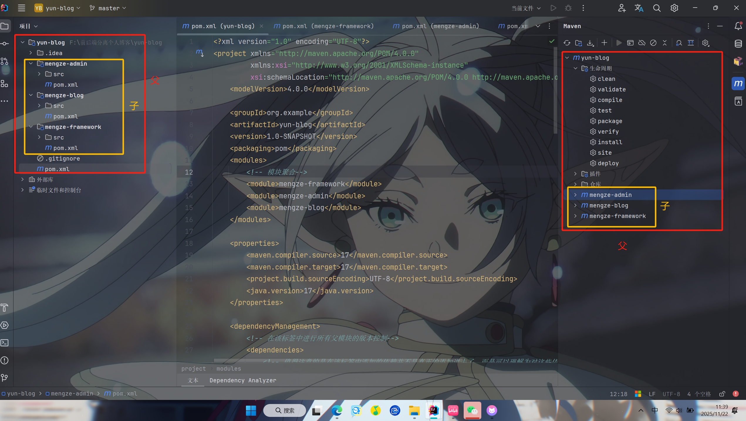 在实际开发中mengze-blog和mengze-admin模块中的一些表单有可能重复(entity,mapper,service)