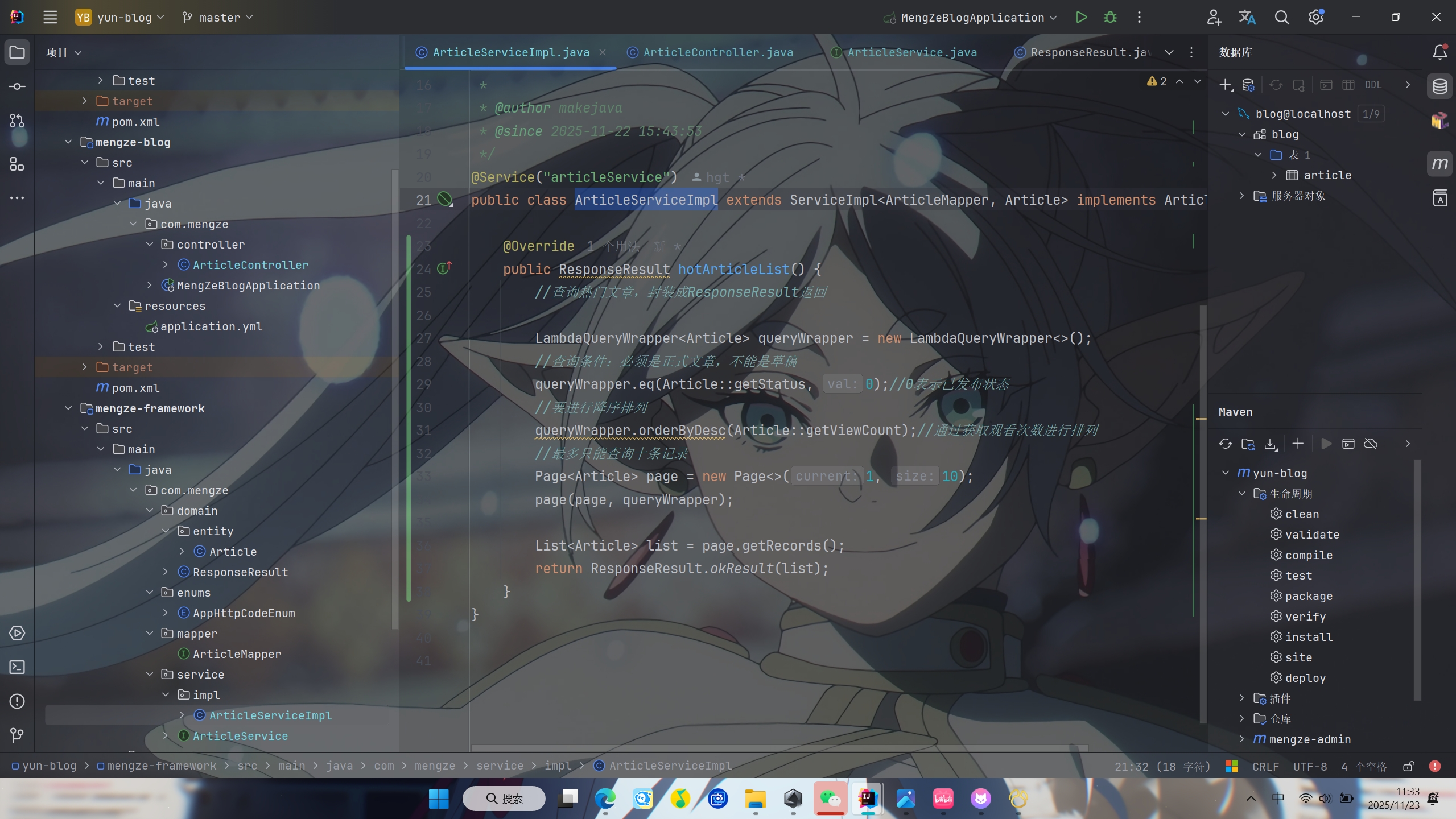 然后在ArticleServiceImpl类中用方法实现查询热门文章封装成ResponseResult返回
