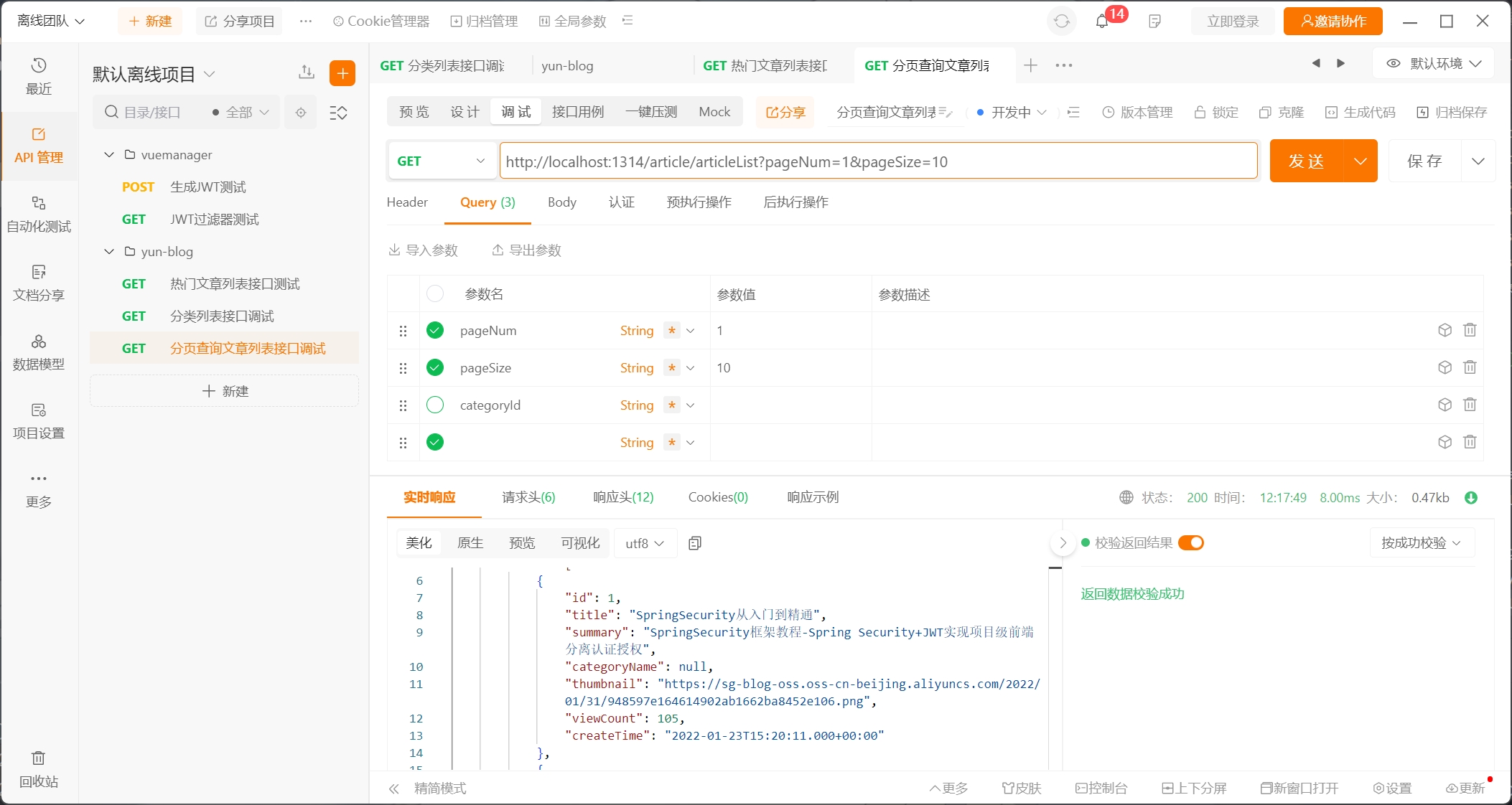 要展示的字段有:标题,发布时间(预留最后更新时间),浏览量,文章的摘要,文章的缩略图,分类标签,文章id,分类id,页码,每页大小,total(总记录数,方面页面根据其判断是否请求传递下一页)等