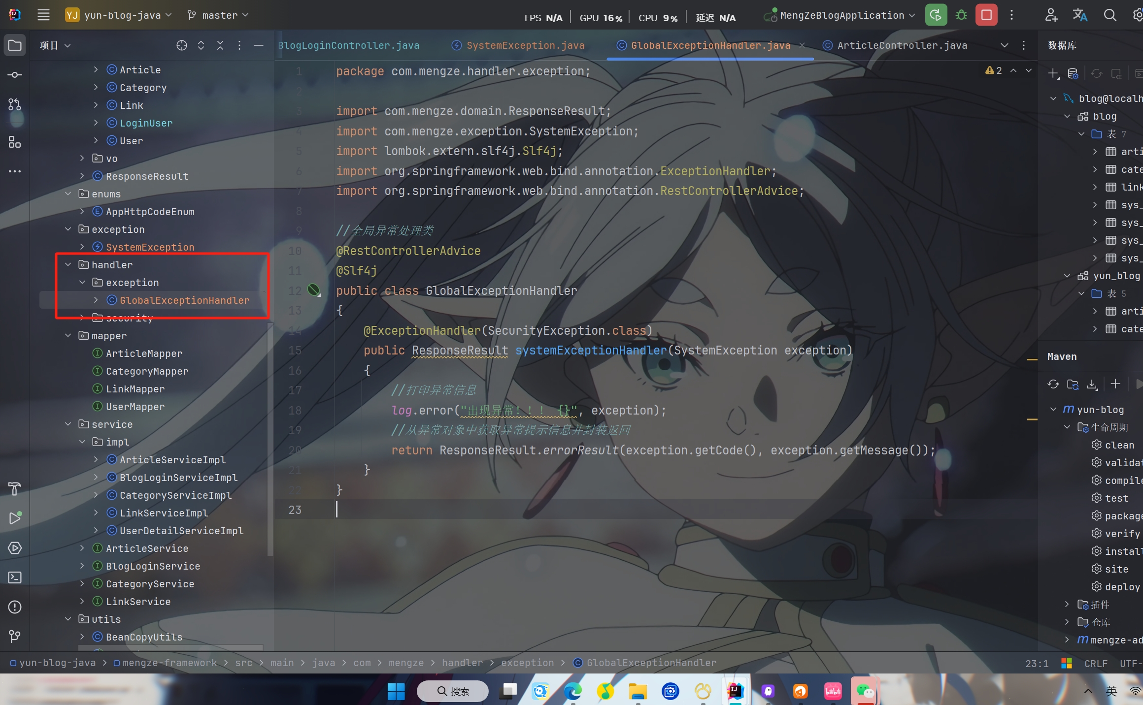| @RestControllerAdvice @Slf4j public class GlobalExceptionHandler { @ExceptionHandler(SecurityException.class) public ResponseResult systemExceptionHandler(SystemException exception) { log.error("出现异常!!! {}", exception); return ResponseResult.errorResult(exception.getCode(), exception.getMessage()); }