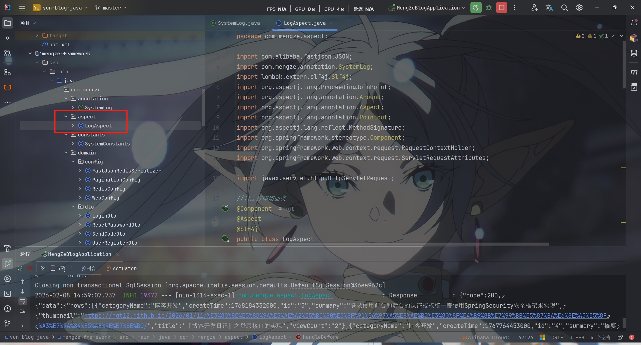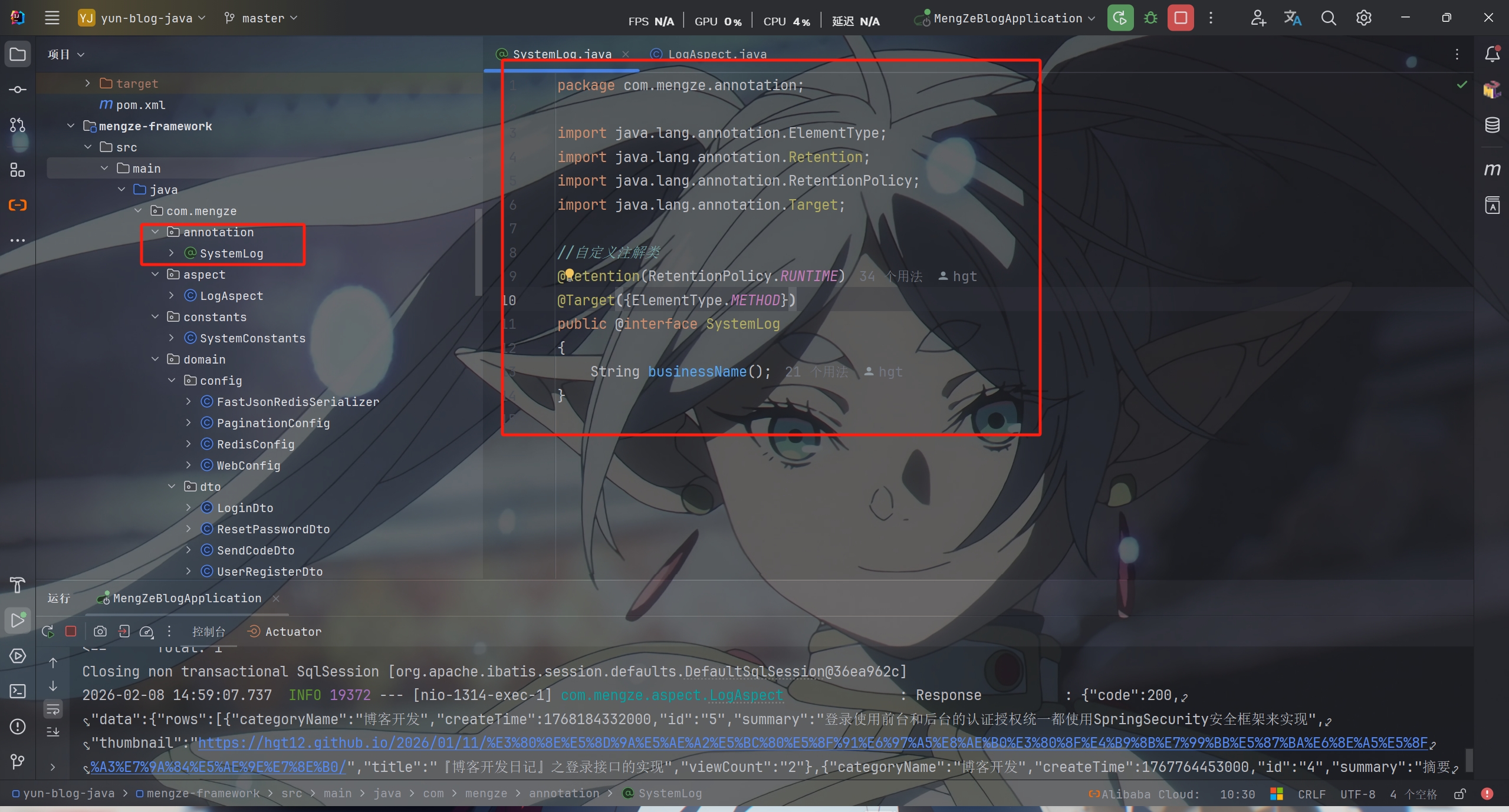 | @Component @Aspect @Slf4j public class LogAspect { @Pointcut("@annotation(com.mengze.annotation.SystemLog)") public void pt() {