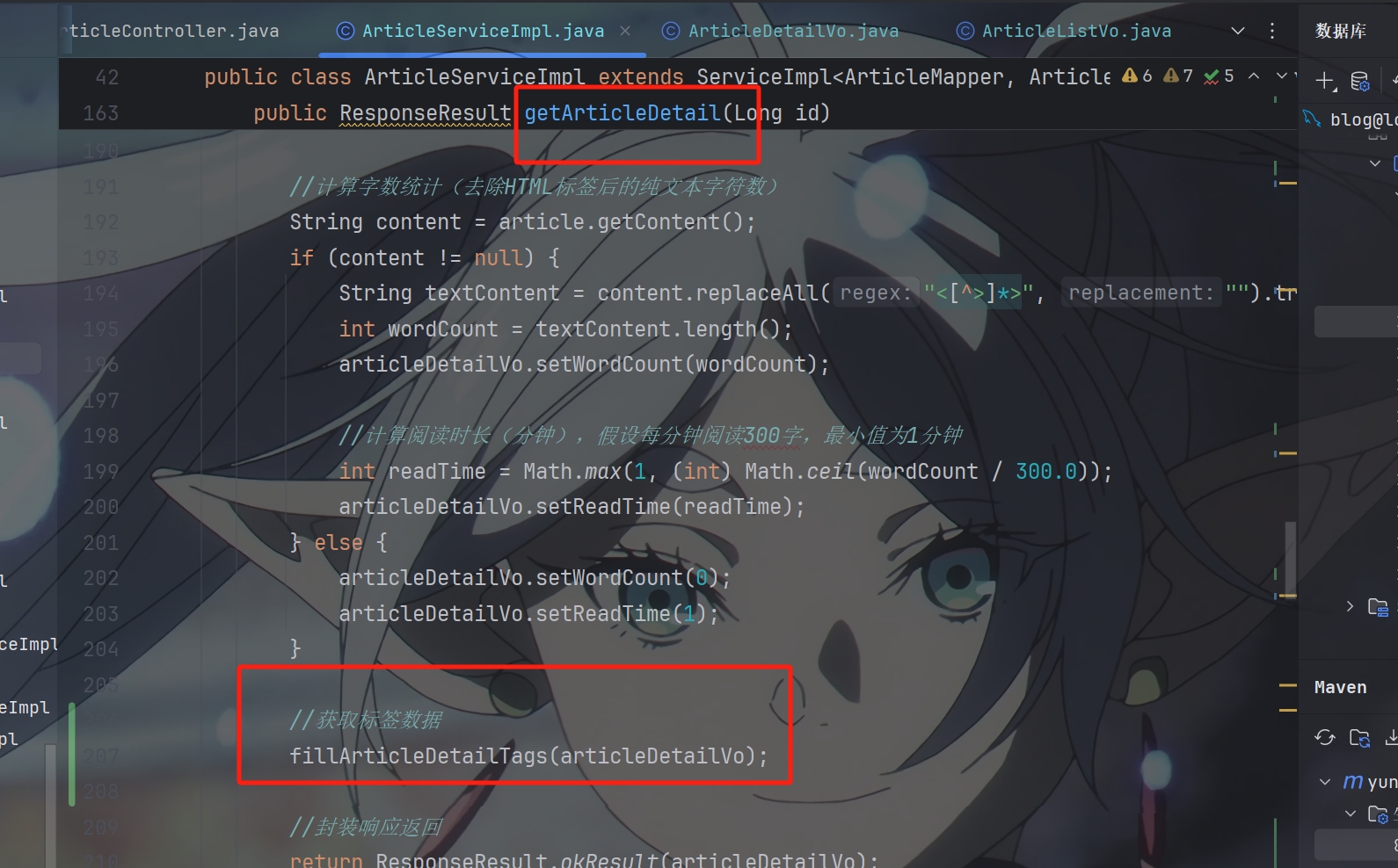 然后在ArticleServiceImpl中写两个私有方法(fillArticleListTags,fillArticleDetailTags)来将标签添加到文章列表和文章详情中