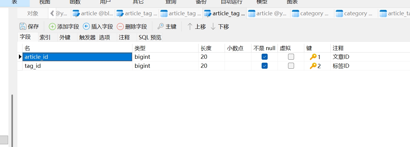 因为一篇文章中可能对应多个标签,所以要创建应该文章标签表